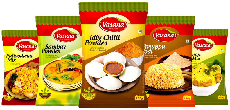 Sambar powder, Idly Chilli powder, Paruppu Podi (Dhal powder), Puliyodarai Rice mix, Lemon mix